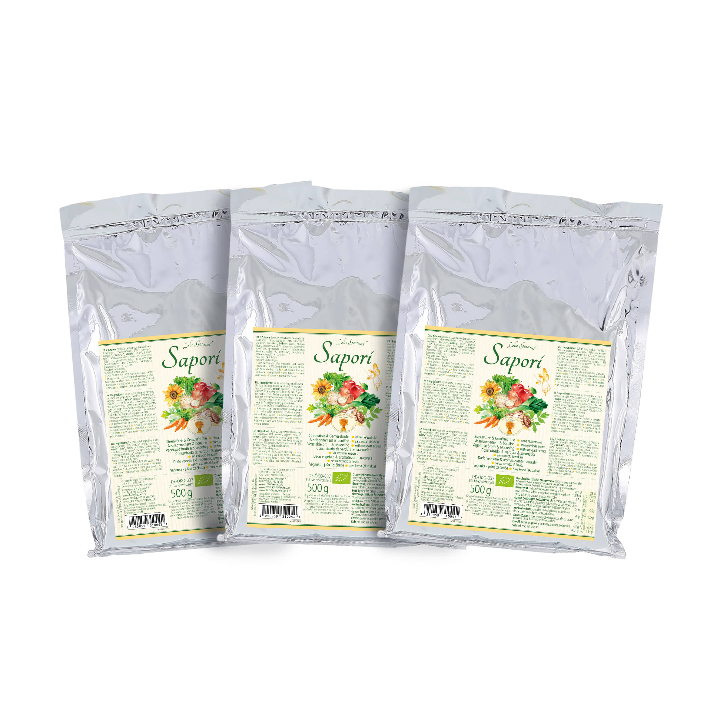 Sel de roche, légumes déshydratés dans des proportions variables 21% (carotte*, oignon*, panais*, céleri*, poireau*, champignons shiitake*, racines de persil*), farine de mais*, pommes séchées* 5%, herbes aromatiques déshydratés dans des proportions variables 4% (feuilles de persil*, livèche*), huile de tournesol* 1%, curcuma*