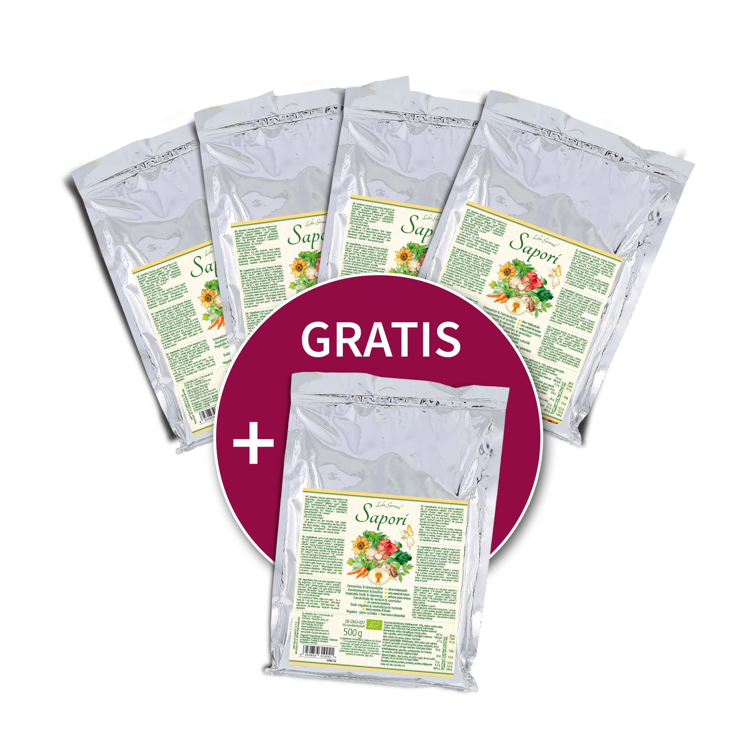 Sel de roche, légumes déshydratés dans des proportions variables 21% (carotte*, oignon*, panais*, céleri*, poireau*, champignons shiitake*, racines de persil*), farine de mais*, pommes séchées* 5%, herbes aromatiques déshydratés dans des proportions variables 4% (feuilles de persil*, livèche*), huile de tournesol* 1%, curcuma*
