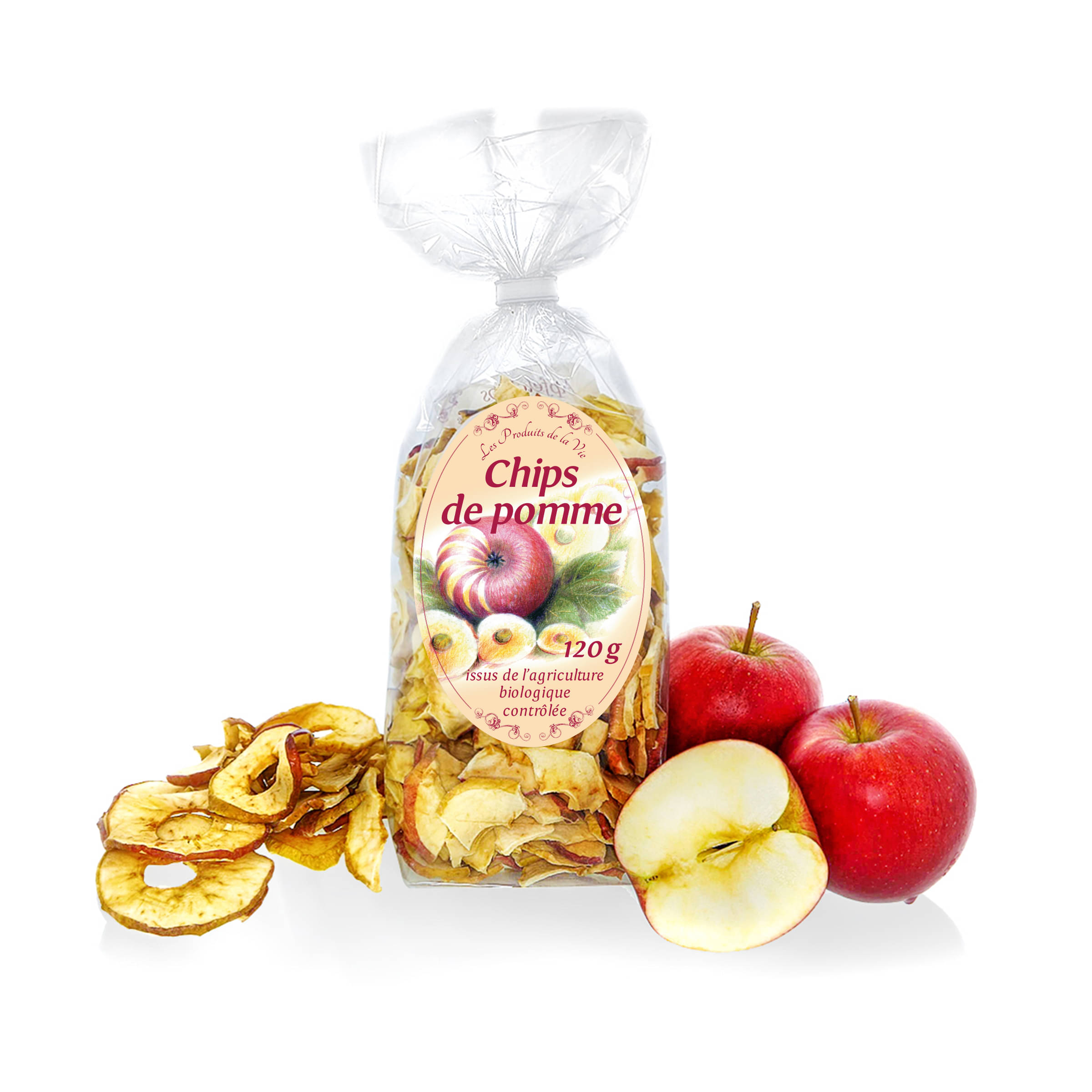 Les pommes issues de l'agriculture biologique contrôlée sont séchées en douceur. Le goût, du doux à l'acidulé, résulte de l'arôme fruité des pommes bien mûres de différentes variétés. 100 g de chips de pommes équivalent à env. 1 kg de pommes. A grignoter en voyage, devant la télé, à l'apéritif, au travail ou l'en-cas pour le sport ou le fitness. Emiettées dans les mueslis, les salades, les potées de légumes, les desserts ou toute autre préparation.
