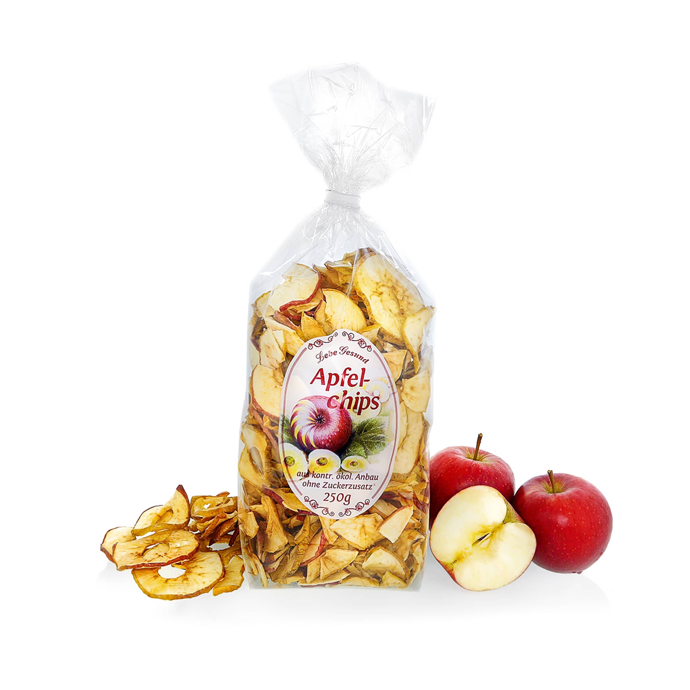 Les pommes issues de l'agriculture biologique contrôlée sont séchées en douceur. Le goût, du doux à l'acidulé, résulte de l'arôme fruité des pommes bien mûres de différentes variétés. 100 g de chips de pommes équivalent à env. 1 kg de pommes. A grignoter en voyage, devant la télé, à l'apéritif, au travail ou l'en-cas pour le sport ou le fitness. Emiettées dans les mueslis, les salades, les potées de légumes, les desserts ou toute autre préparation.