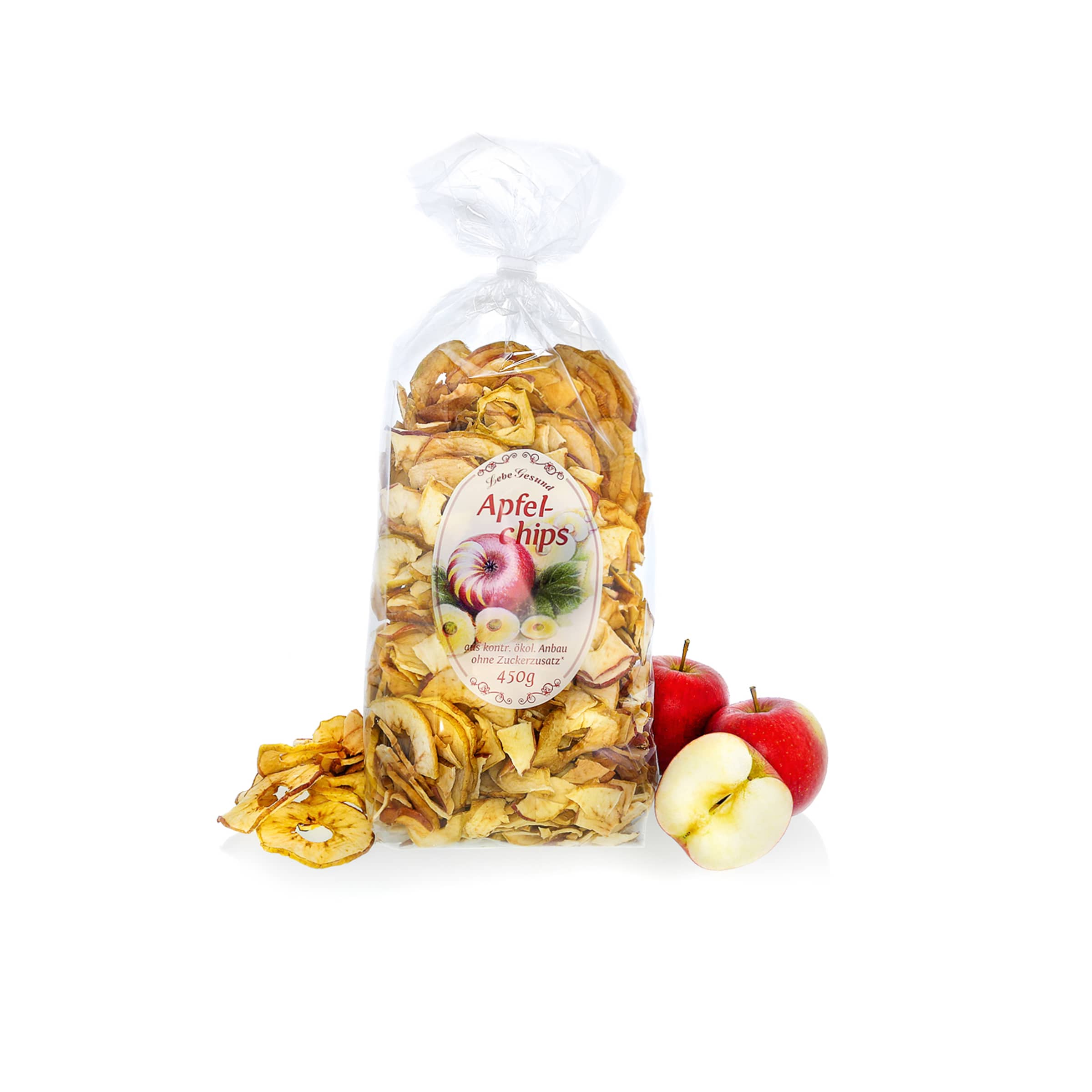 Les pommes issues de l'agriculture biologique contrôlée sont séchées en douceur. Le goût, du doux à l'acidulé, résulte de l'arôme fruité des pommes bien mûres de différentes variétés. 100 g de chips de pommes équivalent à env. 1 kg de pommes. A grignoter en voyage, devant la télé, à l'apéritif, au travail ou l'en-cas pour le sport ou le fitness. Emiettées dans les mueslis, les salades, les potées de légumes, les desserts ou toute autre préparation.