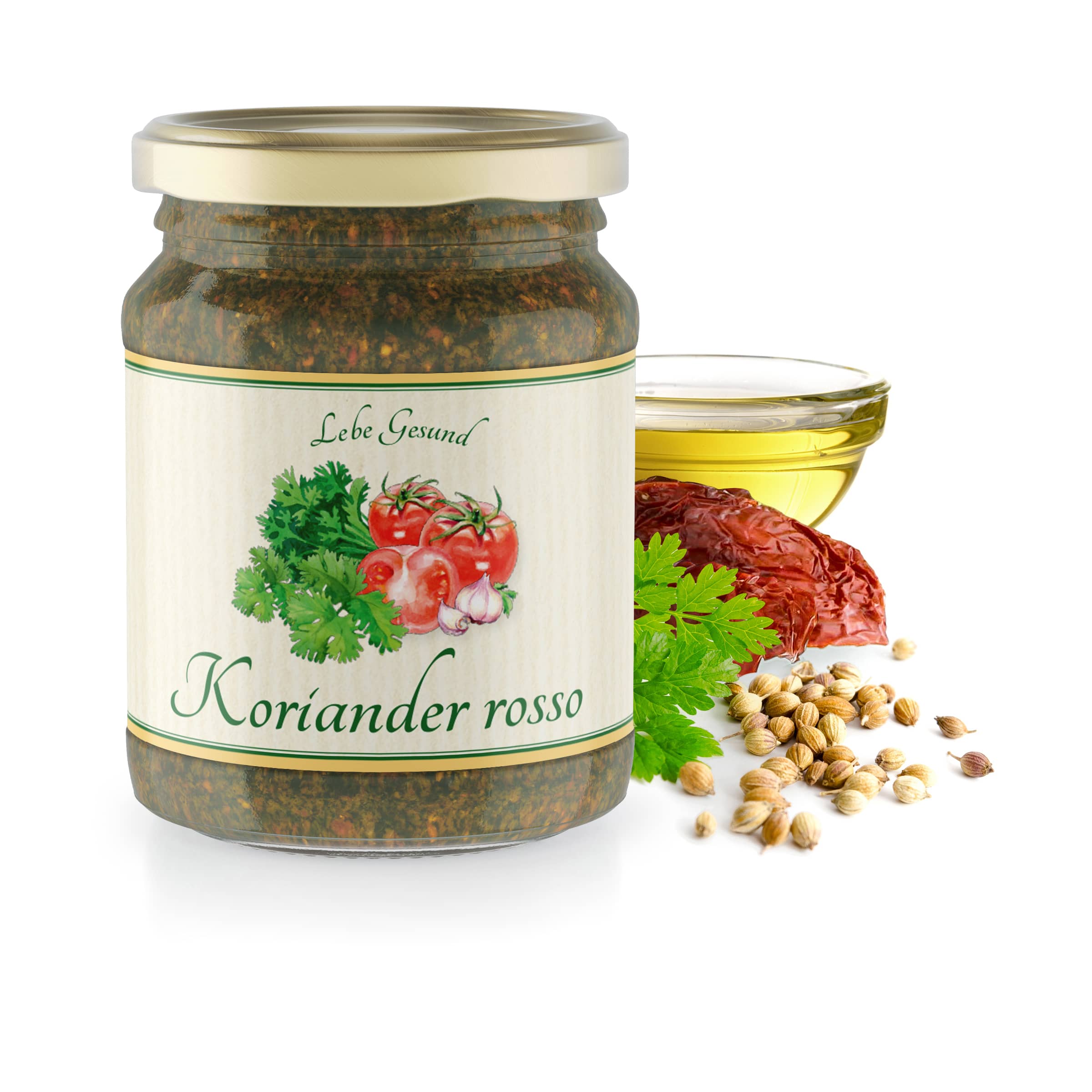 Huile de tournesol*, coriandre* frais 21%, huile d'olive* extra vierge, tomates* séchées 5%, eau, sirop de maïs*, amandes*, sel de roche, ail* 2%, concentré de jus de citron*