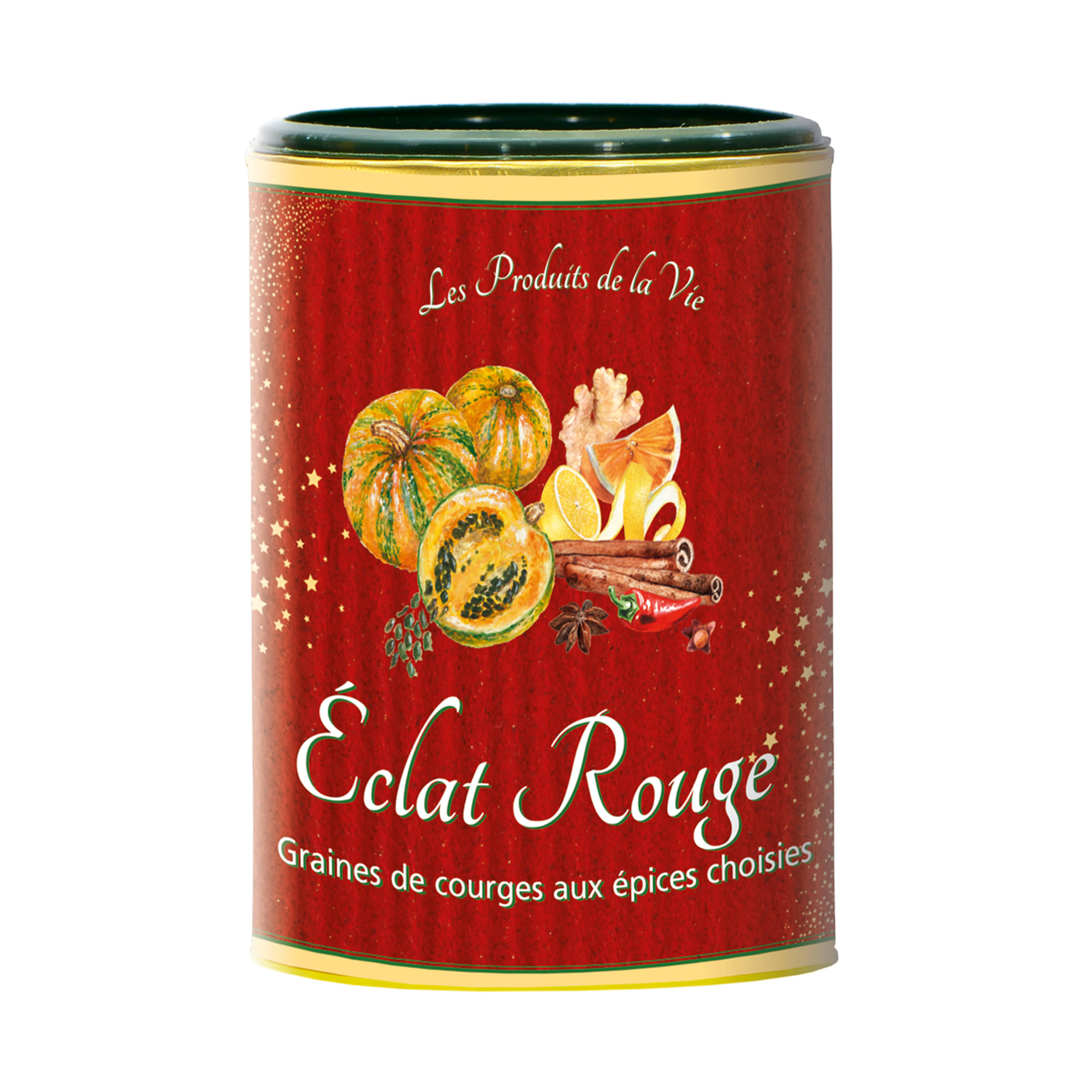 Graines de courge* 59%, sucre de canne* brut, épices* en proportion variable 2,6% (écorce d'orange*, écorce de citron*, cannelle*, clou de girofle*, anis étoilé*, noix de muscade*, cardamome*, gingembre*, piment*)