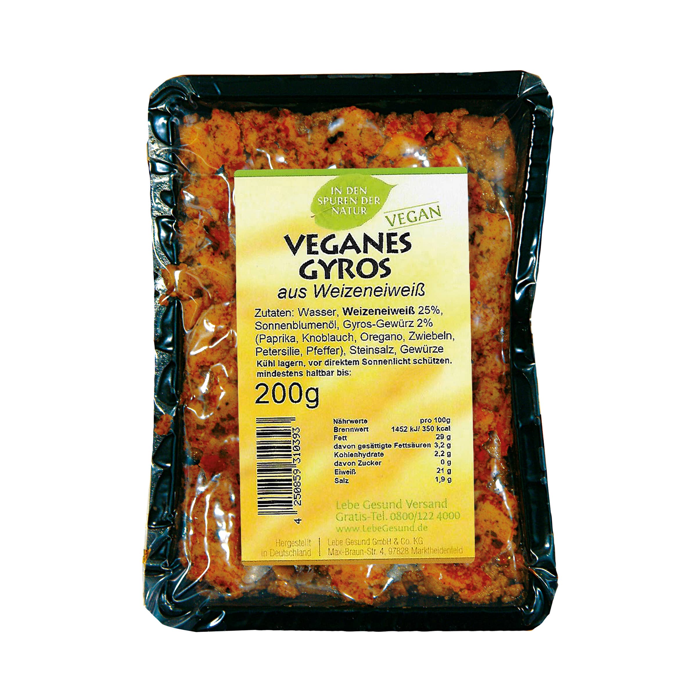 Eau, protéines de blé 25%, huile de tournesol, épices pour gyros 2% (poivron, ail, origan, oignon, persil, poivre), sel de roche, épices