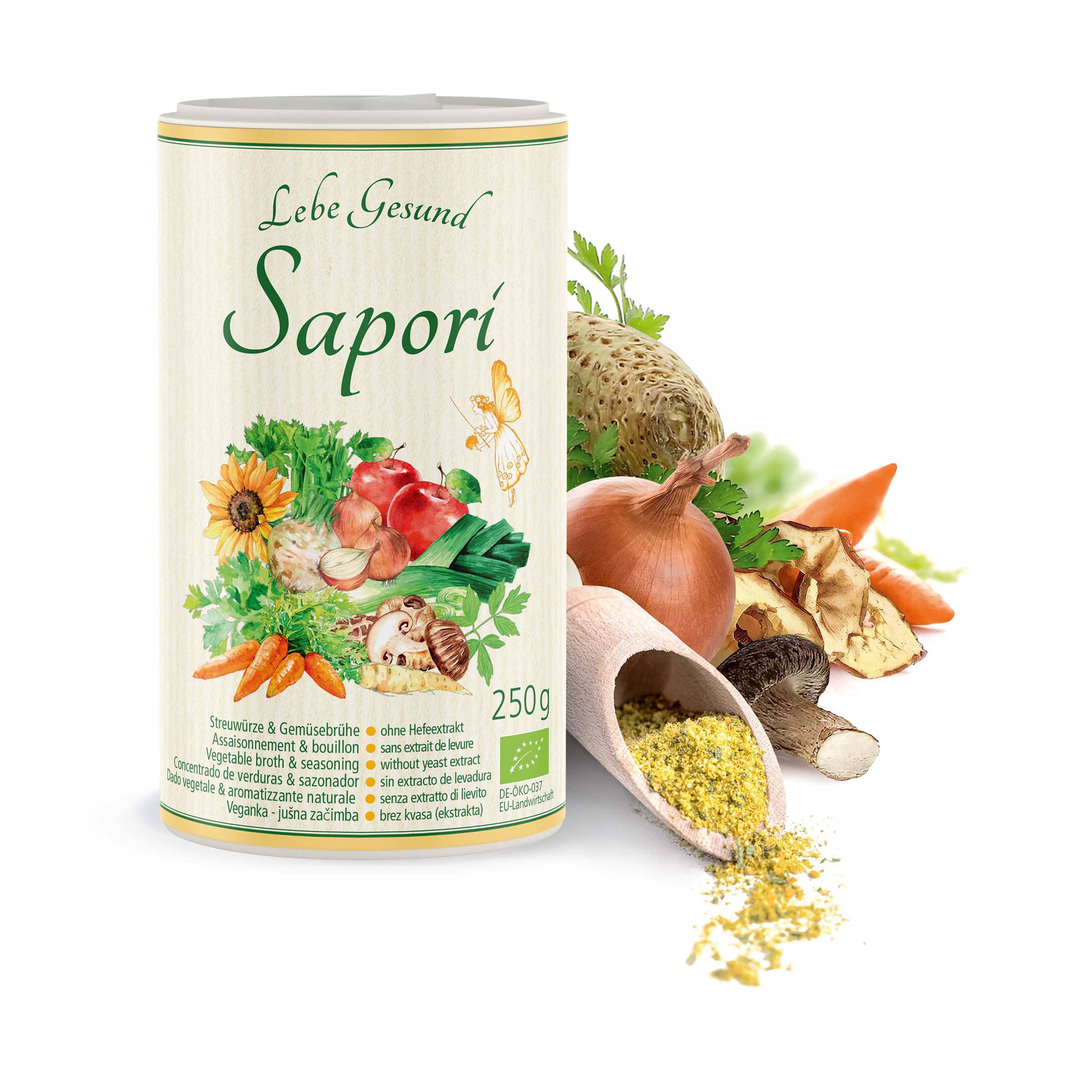 Sel de roche, légumes déshydratés dans des proportions variables 21% (carotte*, oignon*, panais*, céleri*, poireau*, champignons shiitake*, racines de persil*), farine de mais*, pommes séchées* 5%, herbes aromatiques déshydratés dans des proportions variables 4% (feuilles de persil*, livèche*), huile de tournesol* 1%, curcuma*