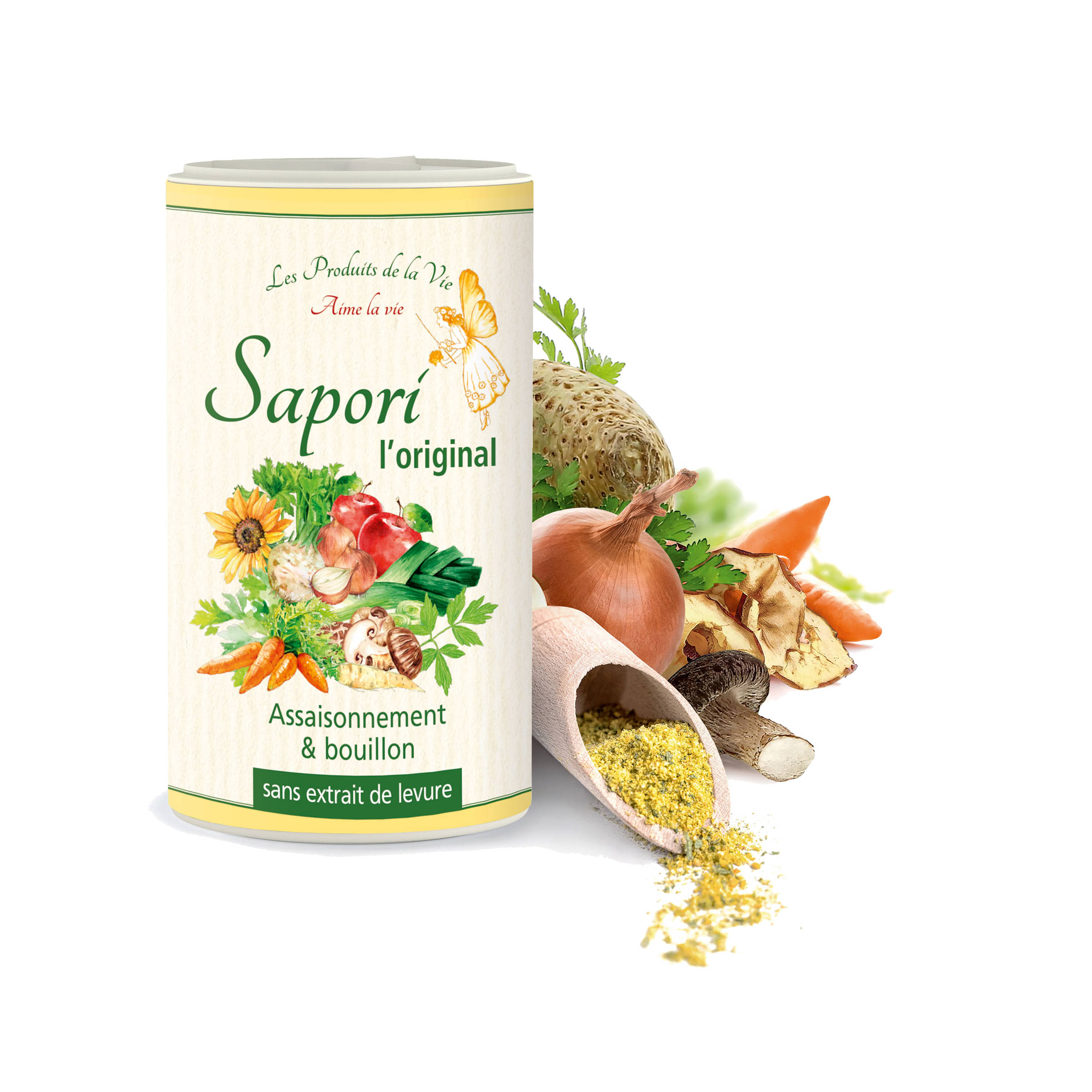 Sel de roche, légumes déshydratés dans des proportions variables 21% (carotte*, oignon*, panais*, céleri*, poireau*, champignons shiitake*, racines de persil*), farine de mais*, pommes séchées* 5%, herbes aromatiques déshydratés dans des proportions variables 4% (feuilles de persil*, livèche*), huile de tournesol* 1%, curcuma*