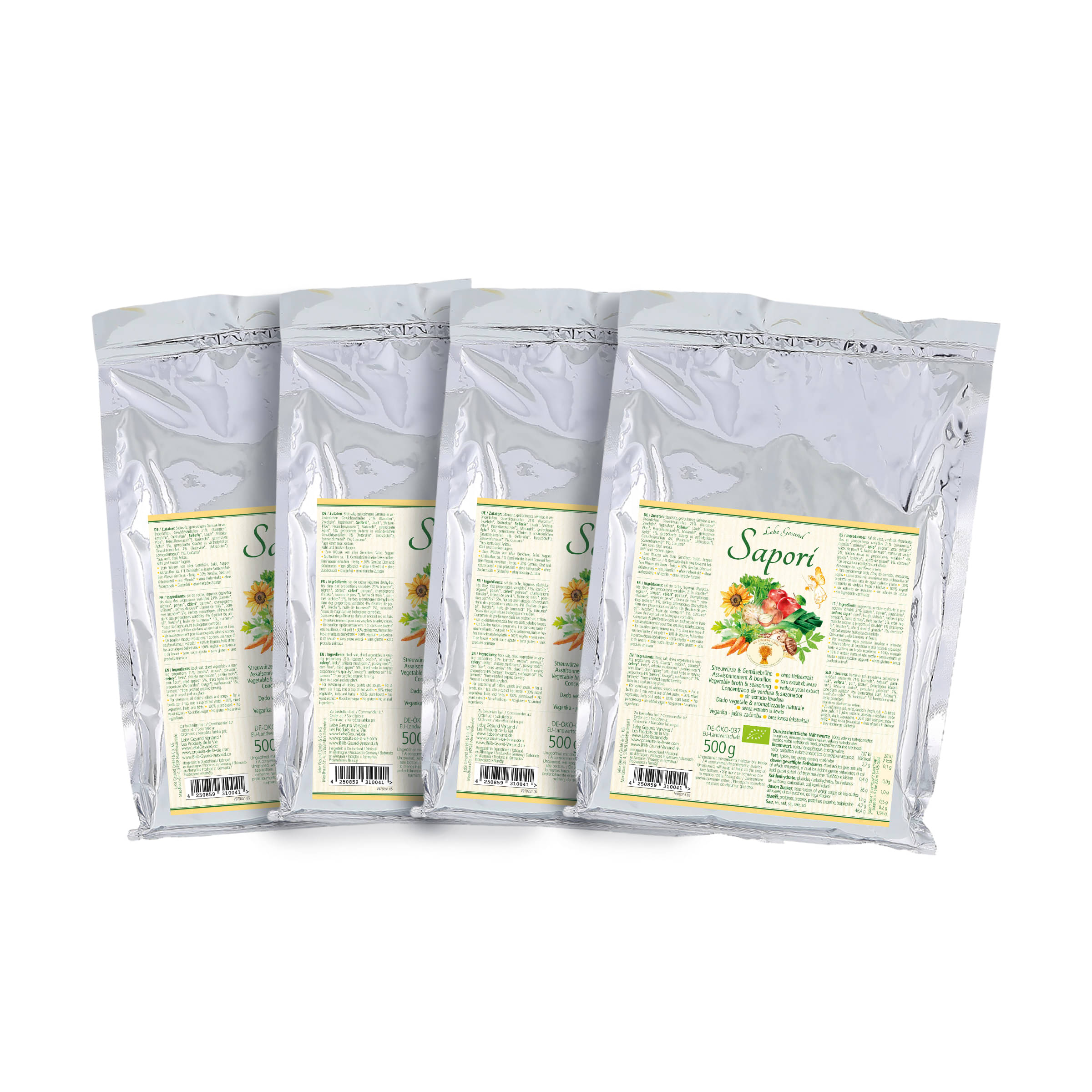 Sel de roche, légumes déshydratés dans des proportions variables 21% (carotte*, oignon*, panais*, céleri*, poireau*, champignons shiitake*, racines de persil*), farine de mais*, pommes séchées* 5%, herbes aromatiques déshydratés dans des proportions variables 4% (feuilles de persil*, livèche*), huile de tournesol* 1%, curcuma*