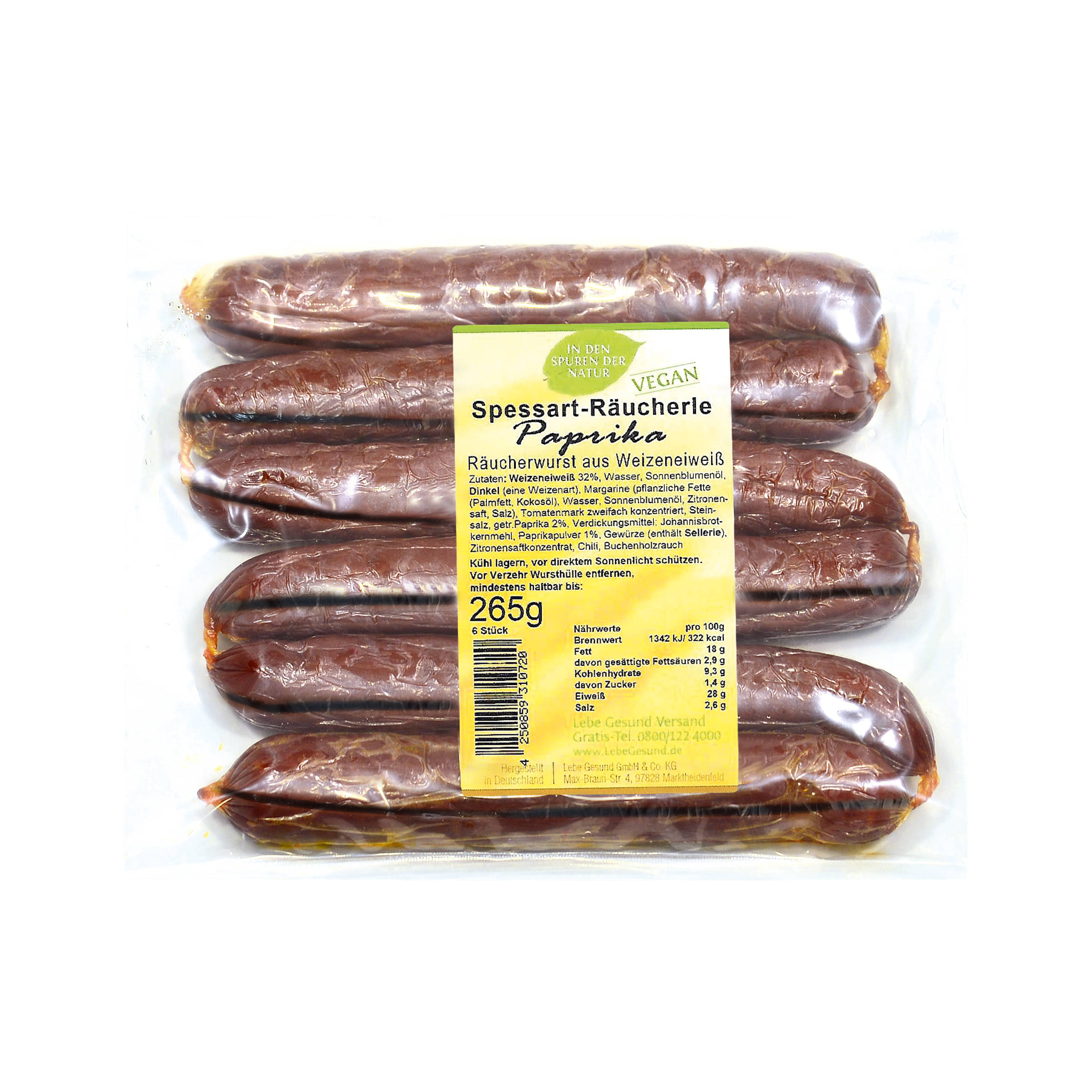 Protéine de blé 32%, eau, huile de tournesol, épeautre (une variété de blé), margarine (matière grasse végétale (huile de palme, huile de noix de coco), eau, huile de tournesol, jus de citron, sel), double concentré de tomates, sel de roche, poivron séché 2%, épaississant : farine de caroube, paprika 1%, épices (contient du céleri), concentré de jus de citron, piment, fumée de bois d'hêtre